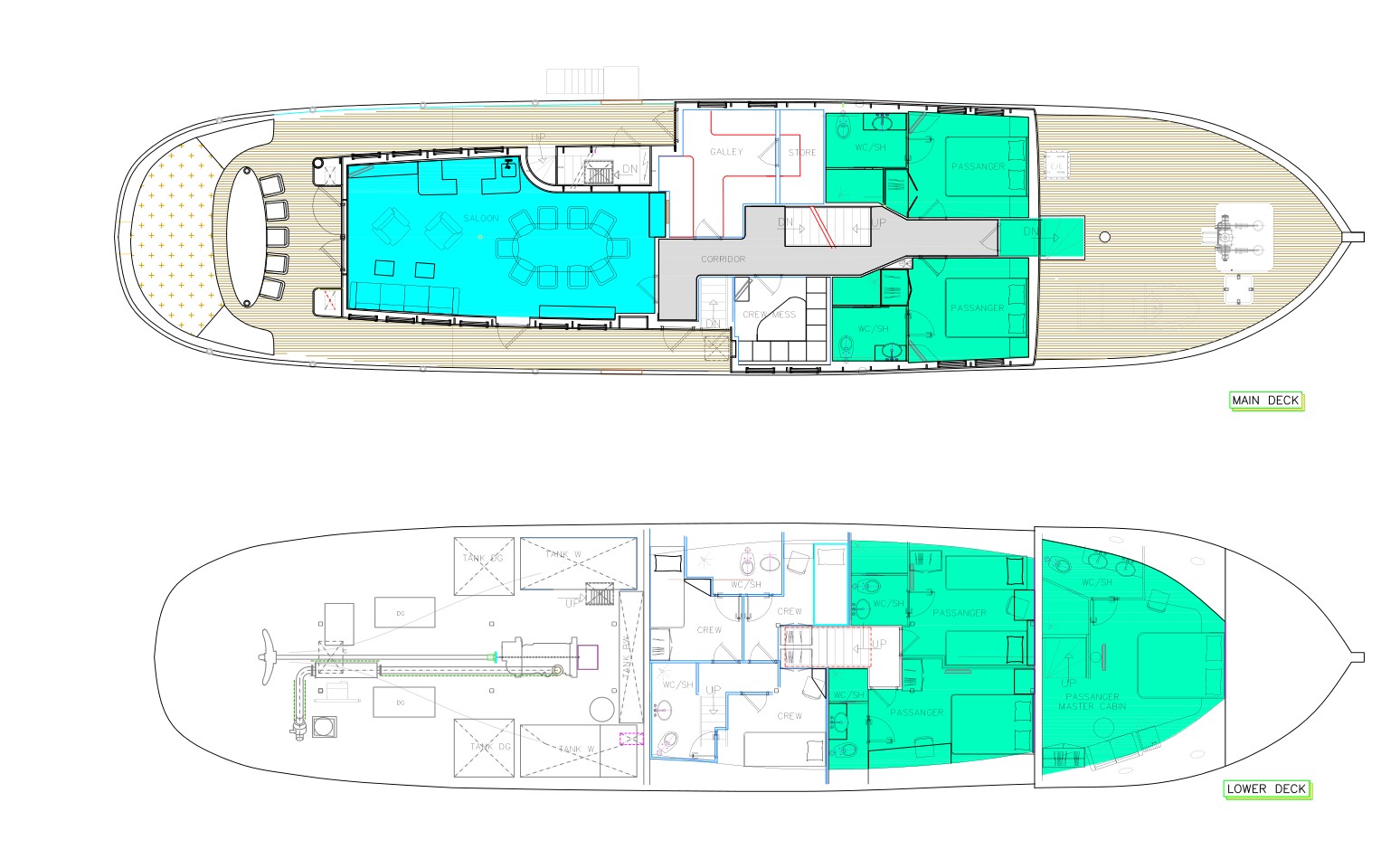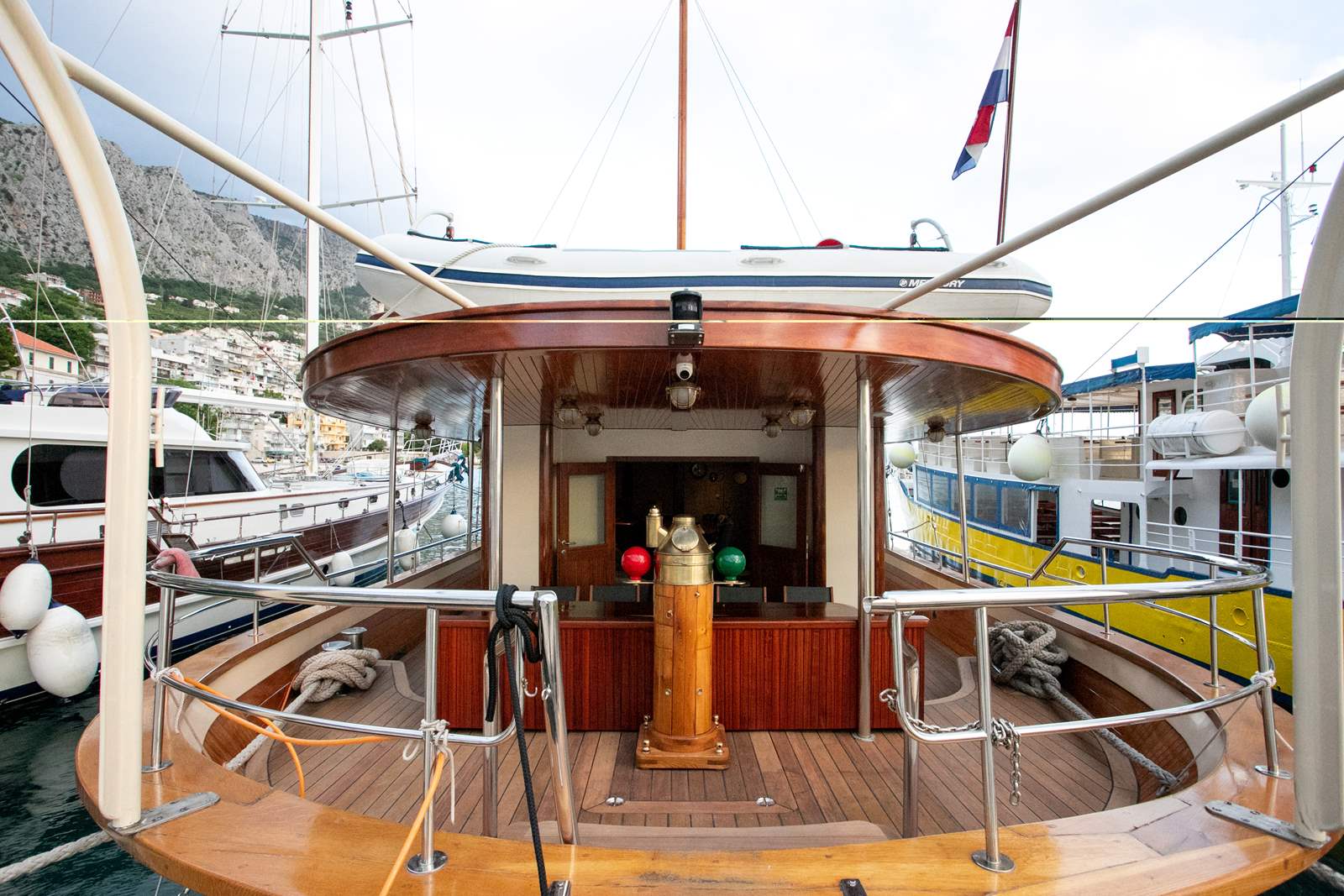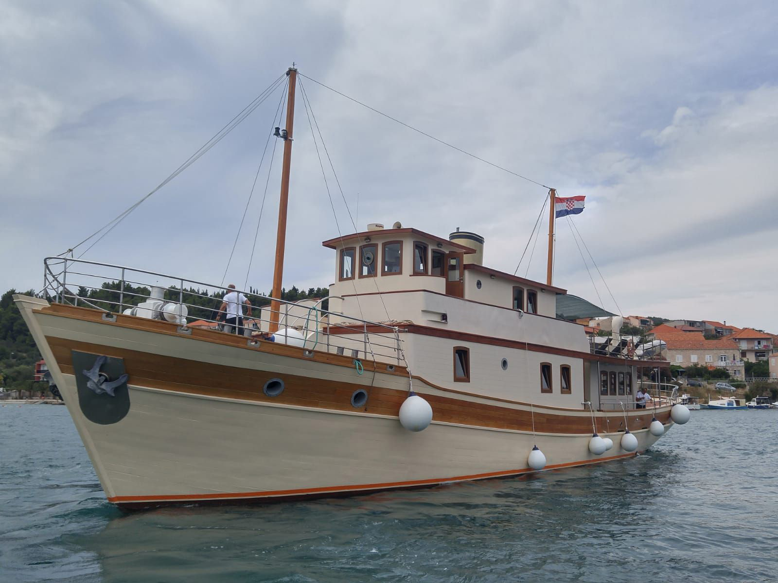 The experienced and professional crew is accommodated in their separate quarters. Our captain comes from the long line of seamen and captains. Navigating the Adriatic runs in his veins. Himself, a chef specialized in traditional Dalmatian cuisine, two sailors and a hostess will be at your disposal during the cruise for everything you might need.
