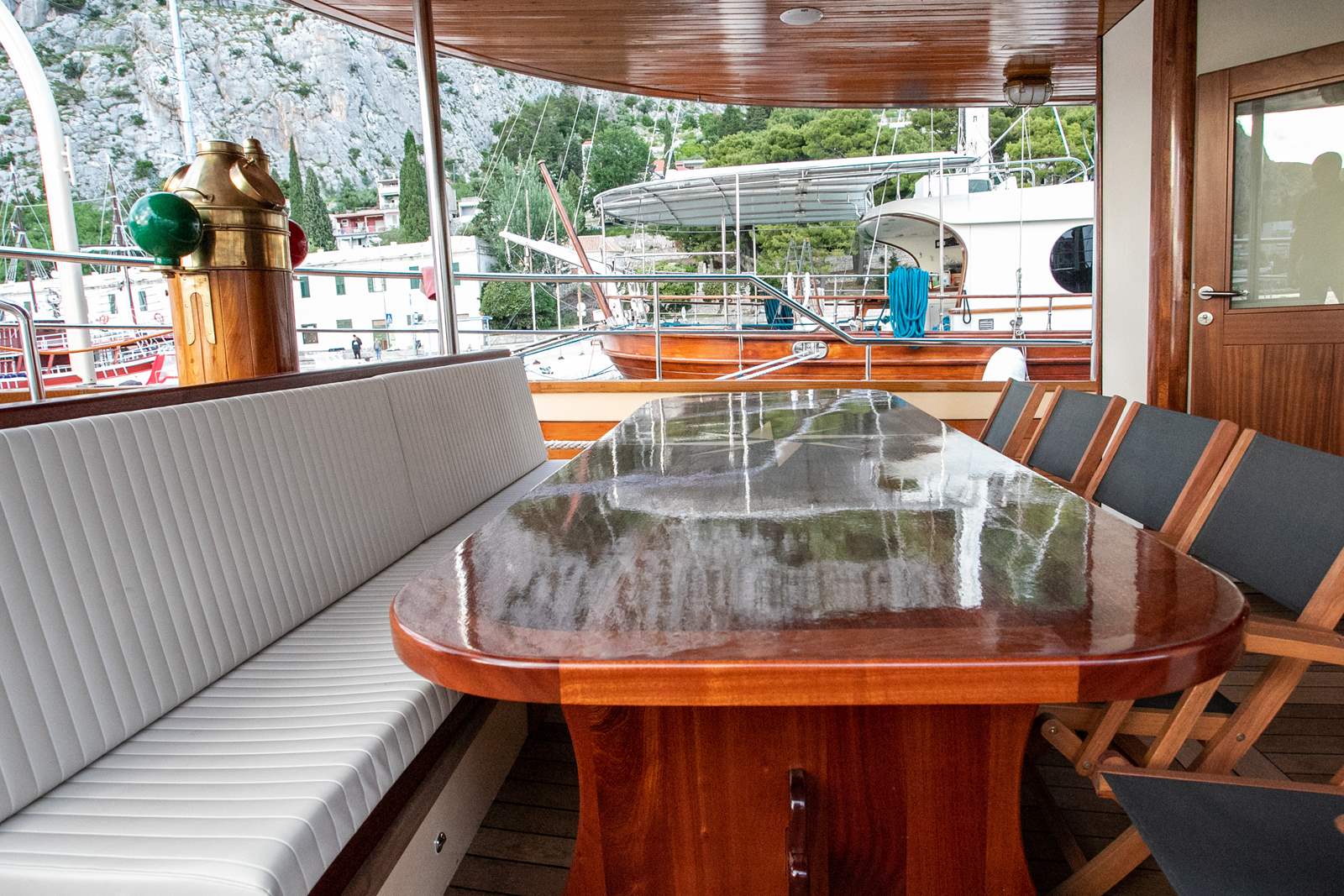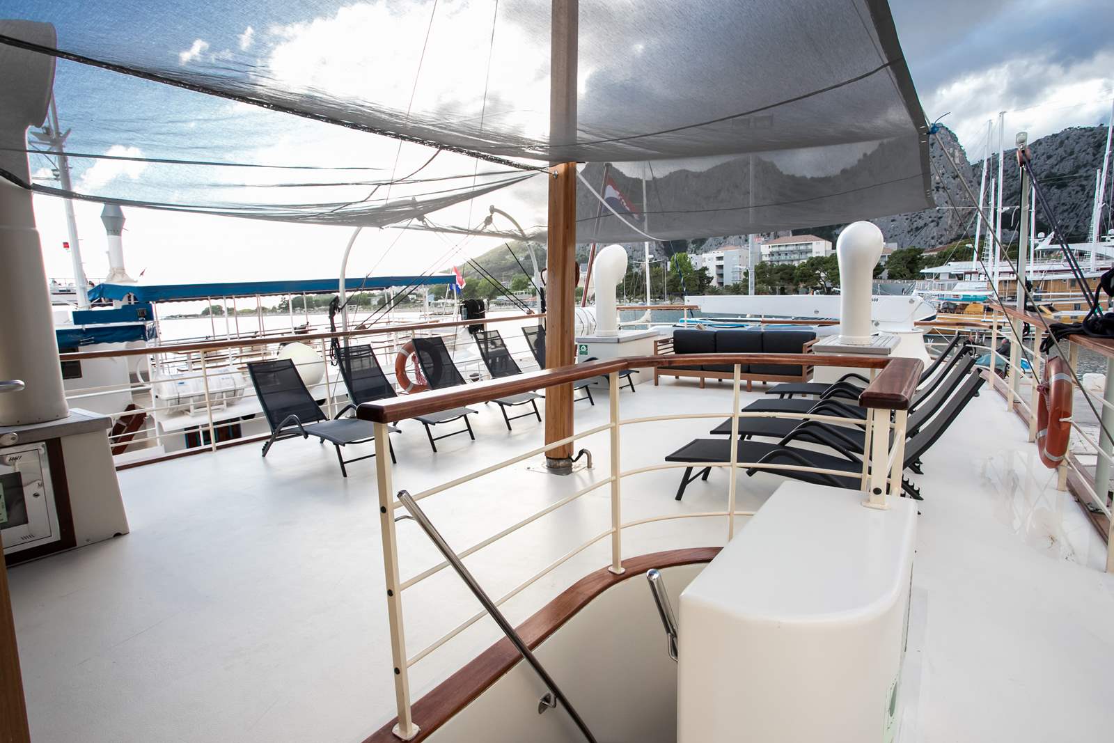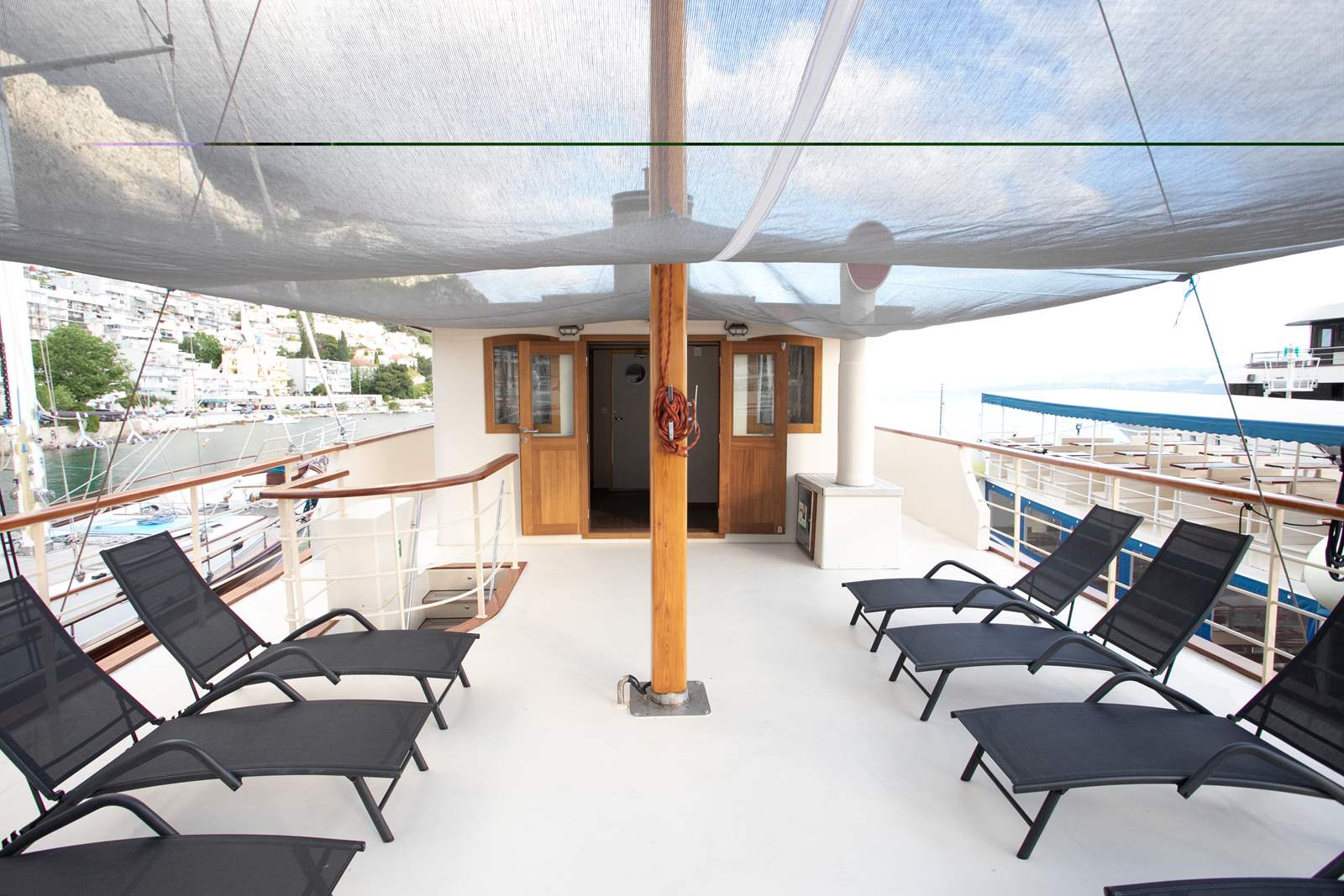 Our guests also love spending a lot of their time outdoors, relaxing and sunbathing on one of the decks. Lounge area on the main deck with table for 10 people is where we serve our meals most of the time. On the sun deck, you can sunbathe on deck chairs or opt for a gym where you will find multiple gym equipment (spinning bike, stepper, dumbbells, yoga mat and more). Next to the sun deck and gym there is also a bathroom.