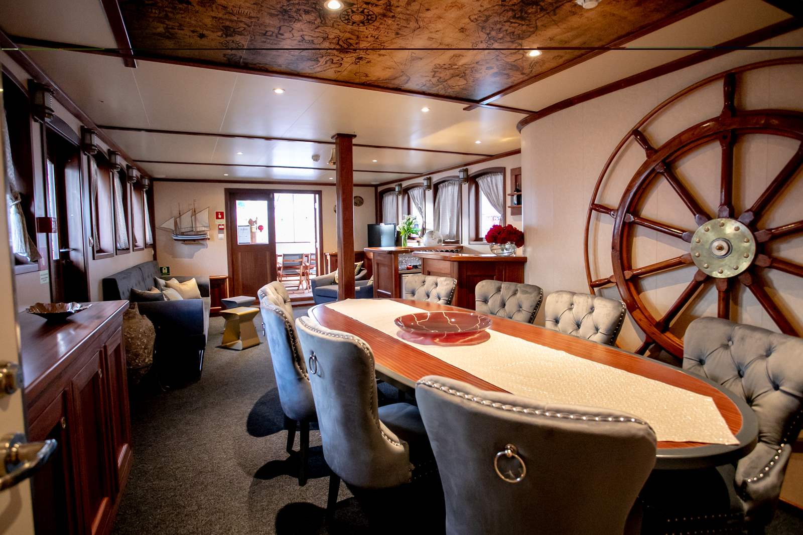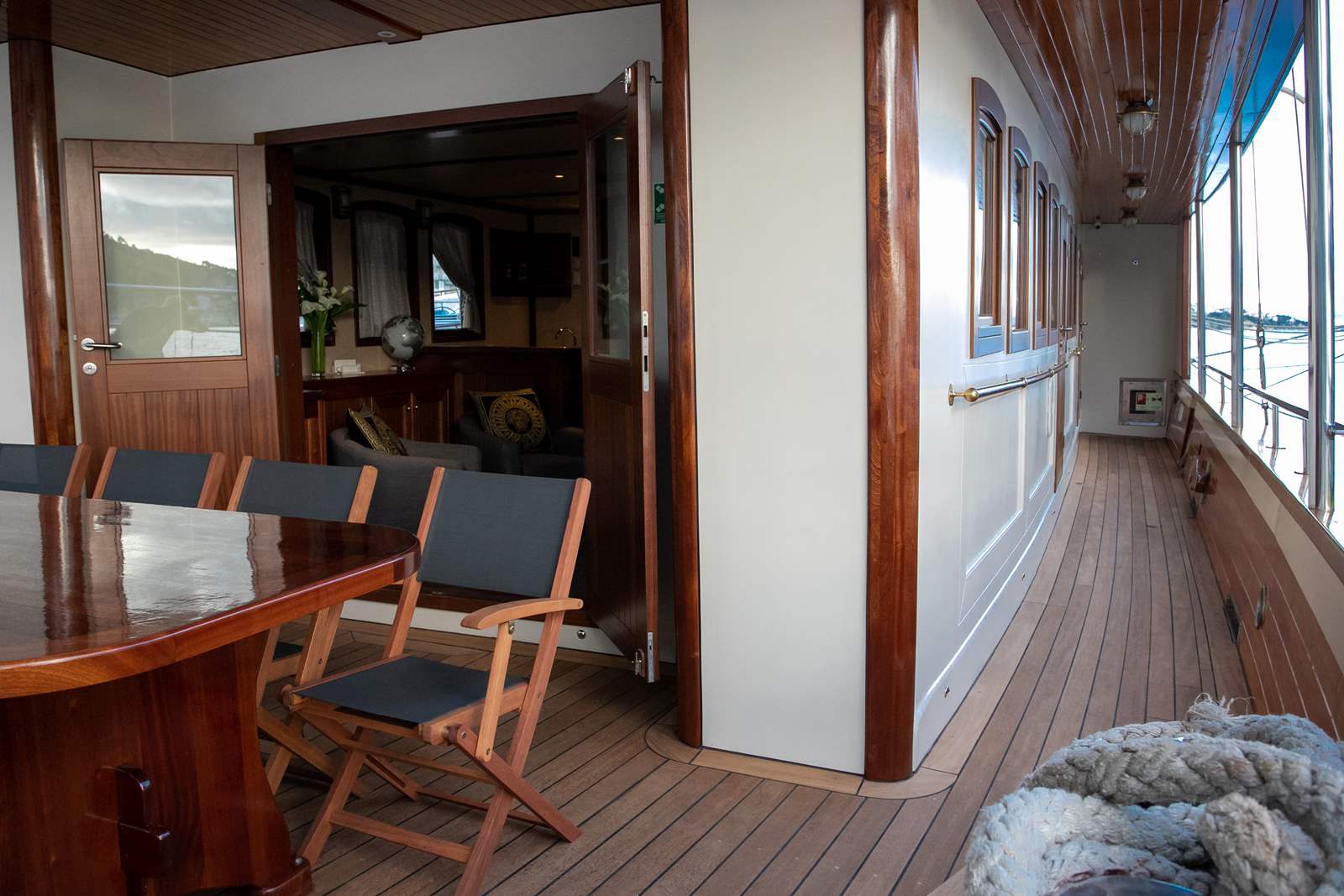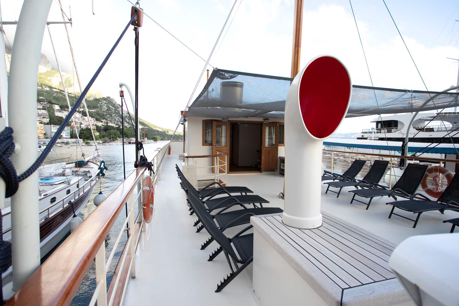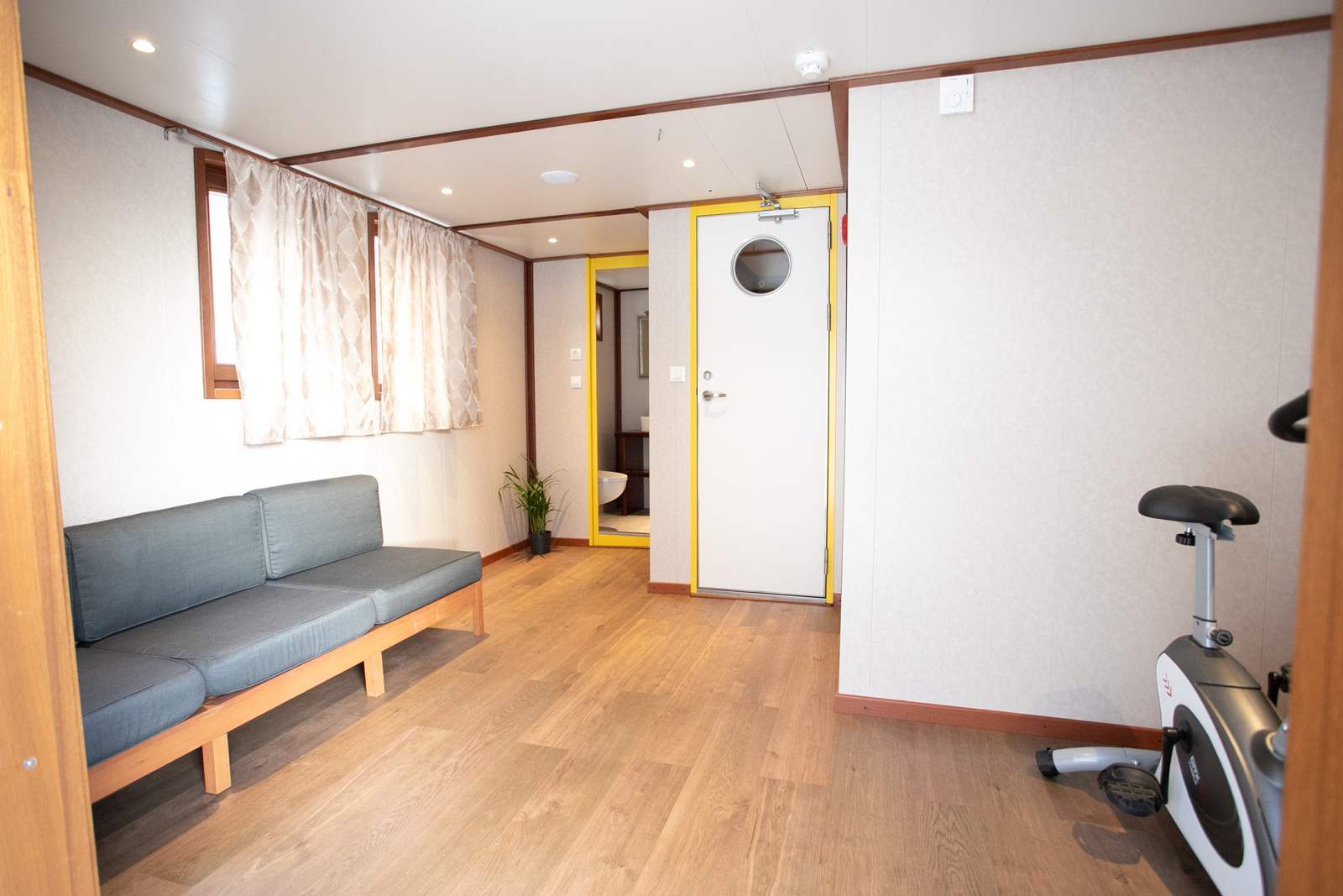 Our guests also love spending a lot of their time outdoors, relaxing and sunbathing on one of the decks. Lounge area on the main deck with table for 10 people is where we serve our meals most of the time. On the sun deck, you can sunbathe on deck chairs or opt for a gym where you will find multiple gym equipment (spinning bike, stepper, dumbbells, yoga mat and more). Next to the sun deck and gym there is also a bathroom.